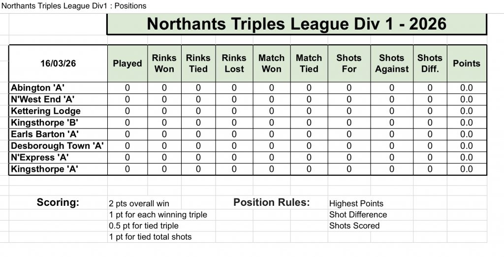 EBBC Northampton Triples League 2026 ‘A’ TeamNorthampton Triples League 2026 – ‘A’ TeamDivision 1Powered By EmbedPress